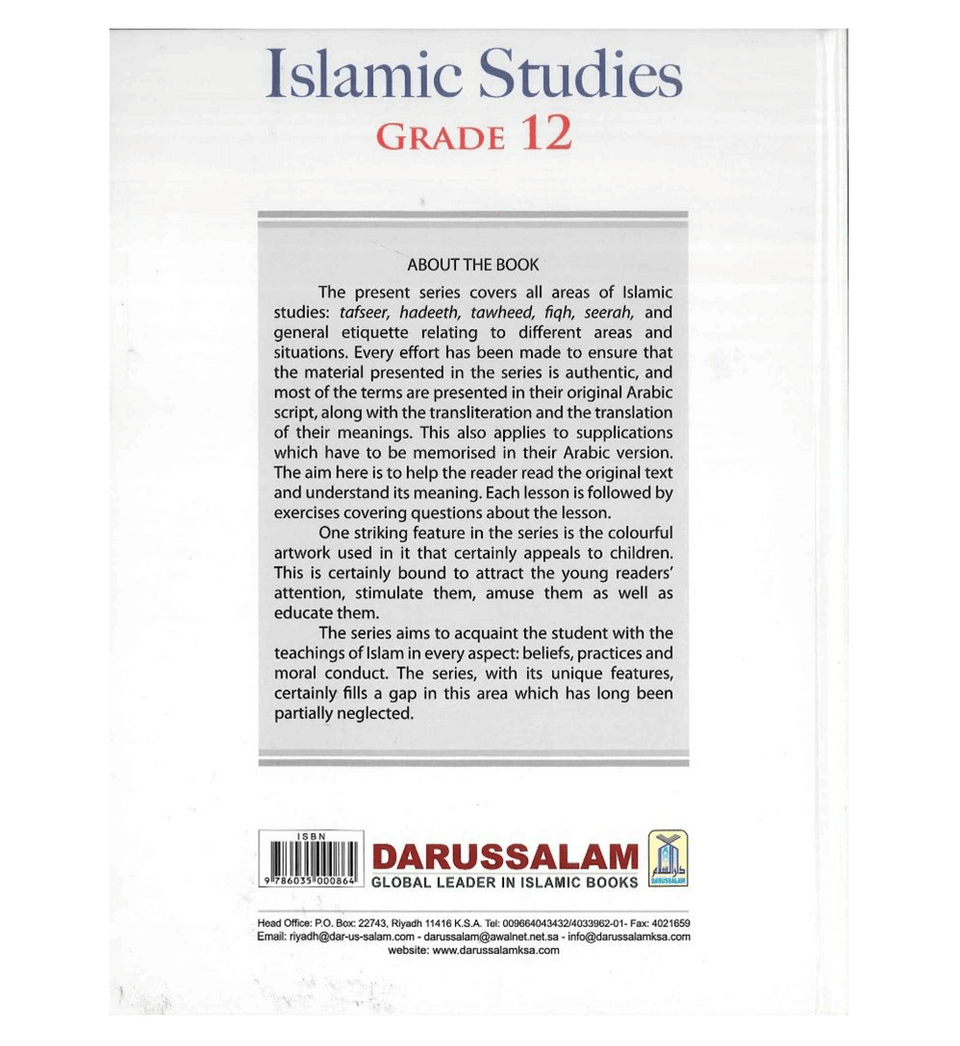 This Grade 12 textbook (for the twelfth grade level) is part of the Islamic Education series which covers all areas of Islamic studies: tafseer, hadeeth, tawheed, fiqh, seerah, and general etiquette relating to different areas and situations. Every effort has been made to ensure that the material presented in the series is authentic, and most of the terms are presented in their original Arabic script, along with the transliteration and the translation of their meanings. This also applies to supplications which have to be memorized in their Arabic version. The aim here is to help the reader read the original text and understand its meaning. Each lesson is followed by exercises covering questions about the lesson.