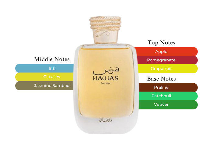 Hawas for Her by Rasasi is a Floral fragrance for women. Hawas for Her was launched in 2015. Top notes are Pomegranate, Apple and Grapefruit; middle notes are Jasmine Sambac, Iris and Citruses; base notes are Praline, Patchouli and Vetiver.
