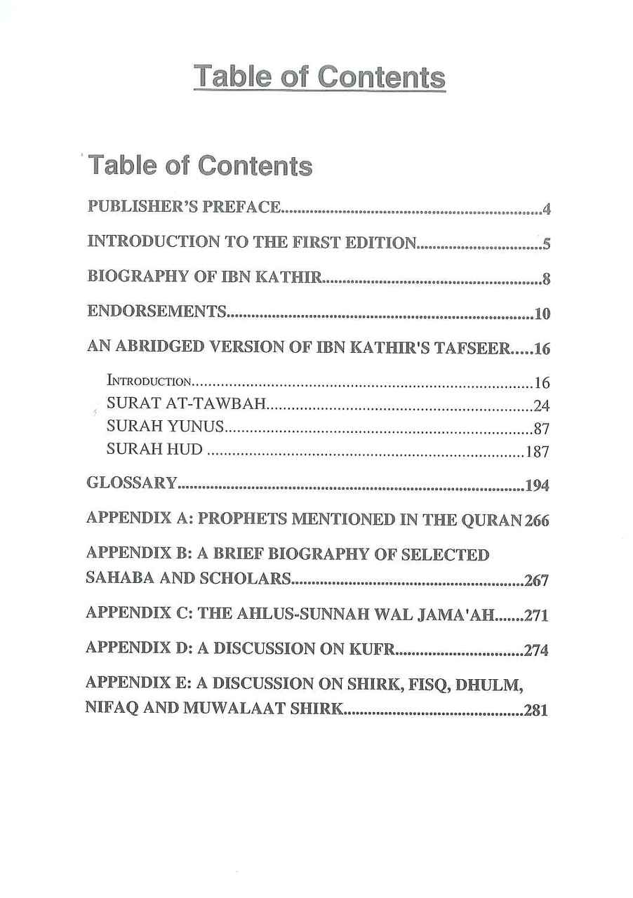 An abridged version of Tafsir Ibn Kathir, which is free from unauthentic Hadiths. The Qur'an is the revelation of Allah's Own Words for the guidance of His creatures. Since the Qur'an is the primary source of Islamic teachings, the correct understanding for the Qur'an is necessary for every Muslim. The Tafsir of Ibn Kathir is the most renowned and accepted explanation of the Qur'an in the entire world. In it one finds the best presentation of Hadiths, history, and scholarly commentary.
